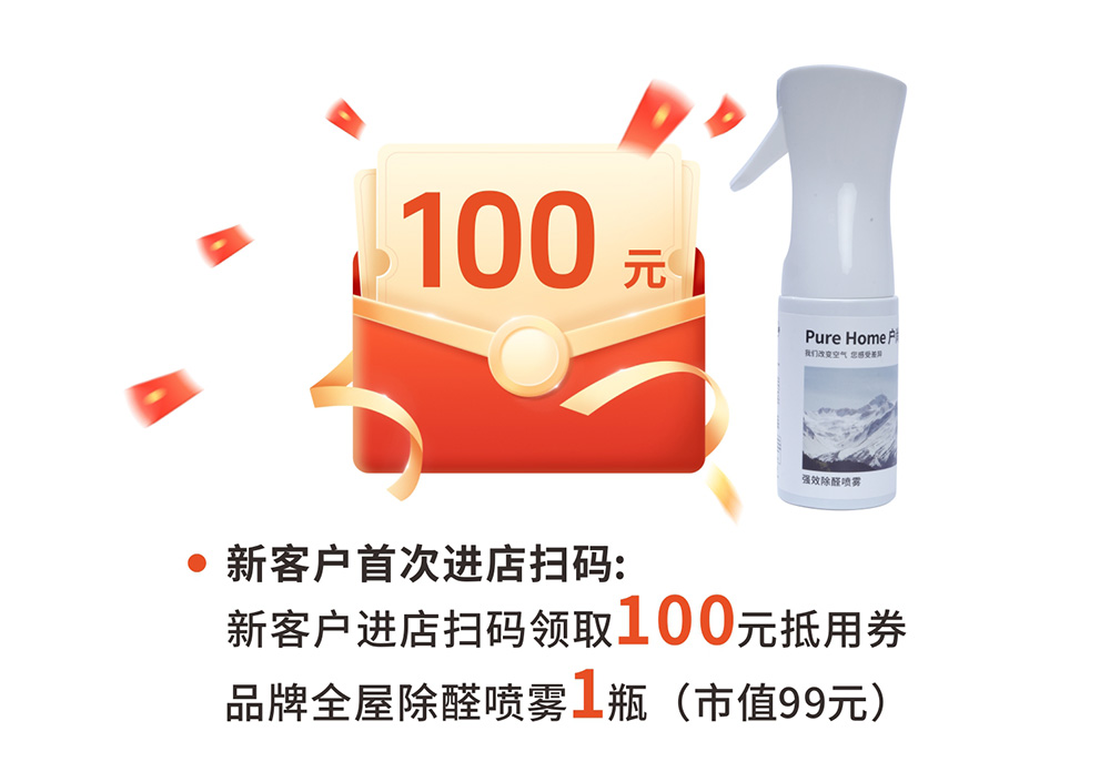 新客户进店扫码领取100元抵用券 品牌全屋除醛喷雾1瓶(价值99元)