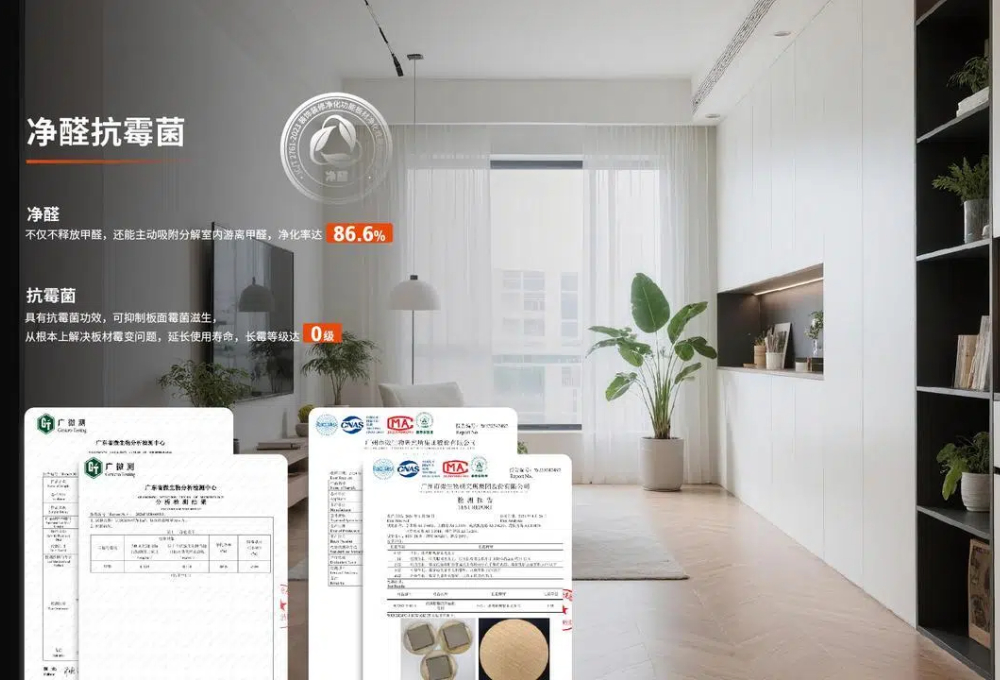 主动净醛黑科技:表面采用甲壳素吸附 纳米硅片分解技术,可净化室内其他来源(如窗帘、沙发)释放的游离甲醛,净化率高达86.7%,形成“自净 外净”双重防护